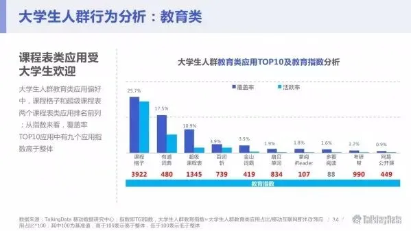 大学生人群教育类应用偏好中,课程格子和超级课程表两个课程表类应用排名前列;从指数来看,覆盖率TOP10应用中有九个应用指数高于整体。