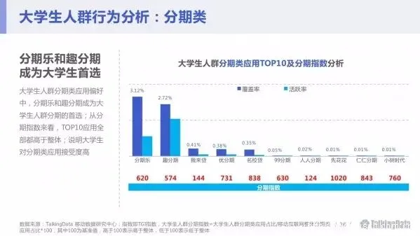 大学生人群分期类应用偏好中,分期乐和趣分期成为大学生人群分期的首选;从分期指数来看,TOP10应用全部都高于整体;说明大学生对分期类应用接受度高。