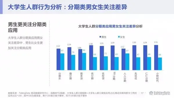 大学生人群分期类应用男女关注差异中,男生比女生更加关注分期类应用。