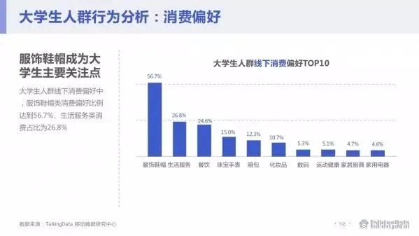 大学生人群线下消费偏好中,服饰鞋帽类消费偏好比例达到56.7%、生活服务类消费占比为26.8%。
