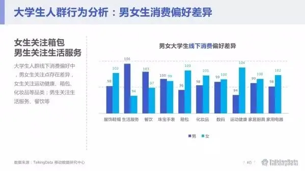 大学生人群线下消费偏好中,男女生关注点存在差异,女生关注运动健康、箱包、化妆品等品类;男生关注生活服务、餐饮等。