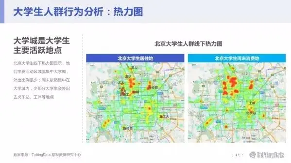 北京大学生线下热力图显示,他们主要活动区域就集中大学城,外出比例很少;周末依然集中在大学城内,少部分大学生会外出去火车站、工体等地点。