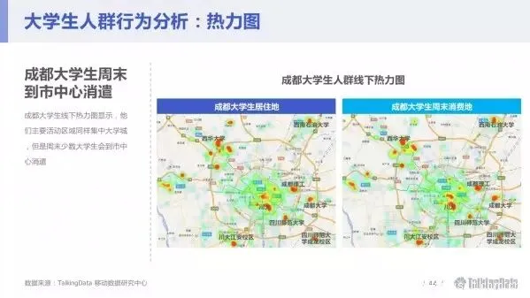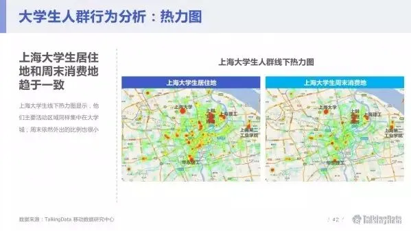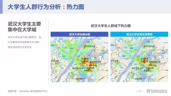 武汉大学生线下热力图显示,他们主要活动区域就集中大学城;周末活动也以大学为主。
