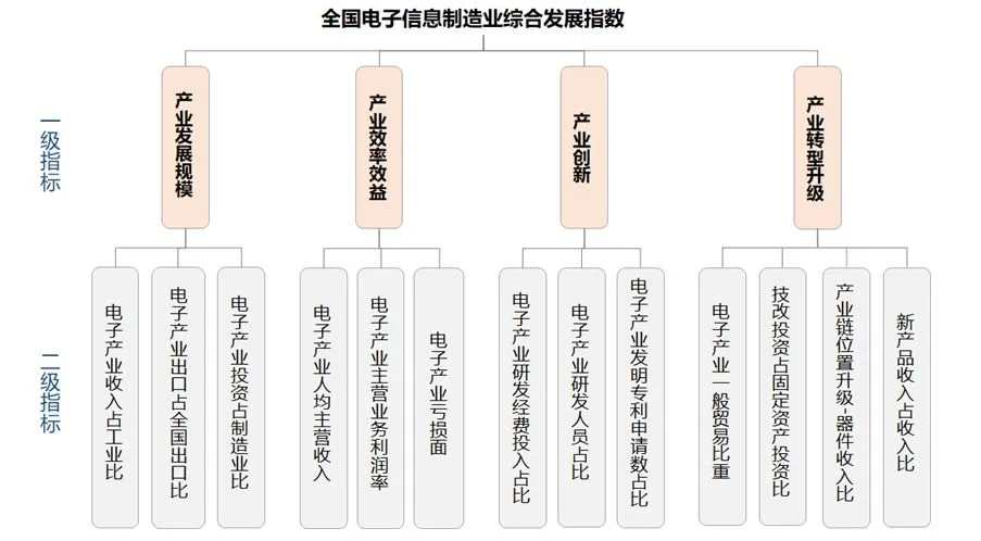 2019年综合发展指数体系按照以下原则进行了调整: 一是凸显高质量发展要求。深入贯彻落实中央新发展理念,加快产业转型升级进程,重点强化创新驱动、产业结构优化等方面指标,引导行业向高质量增长的方向发展。 二是引导新兴行业快速成长。为充分体现电子信息制造业创新活跃的特点,反映行业新动力发展态势,充分考虑新型智能消费设备、新产品增长等情况。 三是优化平衡指标体系结构。加强对行业总体与重点领域、内部与外部需求、近期与远期等指标之间的平衡,体现对关键指标变动的敏感性。 2019年综合发展指数形成产业发展规模、产业效率效益、产业创新和产业转型升级4个一级指标,13个二级指标的指标体系,数据基础以2018年国家统计局行业数据为主,辅以我部统计的电子信息制造业统计年报数据。