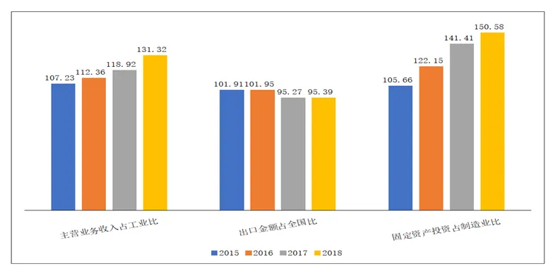 产业发展规模一级指标值为125.76,在四个一级指标中得分保持最高,且比上年上升7.23个分值。其中主营业务收入占工业比和固定资产投资占制造业比增幅突出,对一级指标的贡献分别达到57%和42%,电子信息制造业在工业经济中的地位和贡献进一步提升。