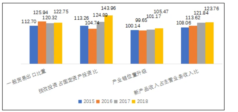 产业转型升级一级指标值123.07,比上年上升7.05个分值,在四个一级指标中得分排第二位,且四年来实现稳步提升。其中技改投资占比和产业链位置升级两个指标增长最明显,对一级指标增长的贡献分别达到68%和18%,行业在技术改造升级和产业结构平衡两方面取得新的进步。