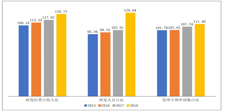 产业创新一级指标值119.13,比上年上升12.15个分值,在四个一级指标中增幅最为突出,对指数上升拉动作用凸显。其中研发人员占比和研发经费投入占收入比两个指标增幅较大,分别提升26.63个和9.11个分值,对一级指标增长的贡献率分别达到57%和27%。高创新投入必将在未来带来创新成果的提升,从而提升产业的长期竞争力。
