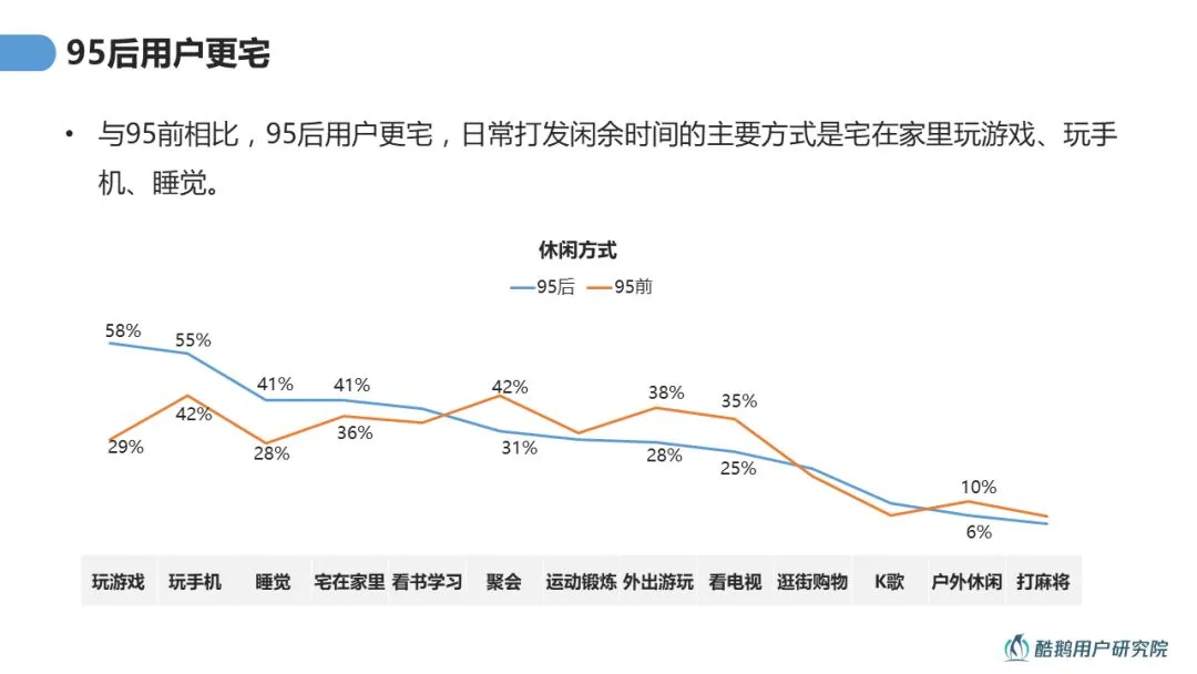 崇尚“宅”文化的95后,宅在家里打游戏、看视频、睡觉是他们普遍的放松与娱乐方式。在内容追求上以“娱乐至上”“兴趣导向”为宗旨,对于正经严肃的内容95后并不买单。