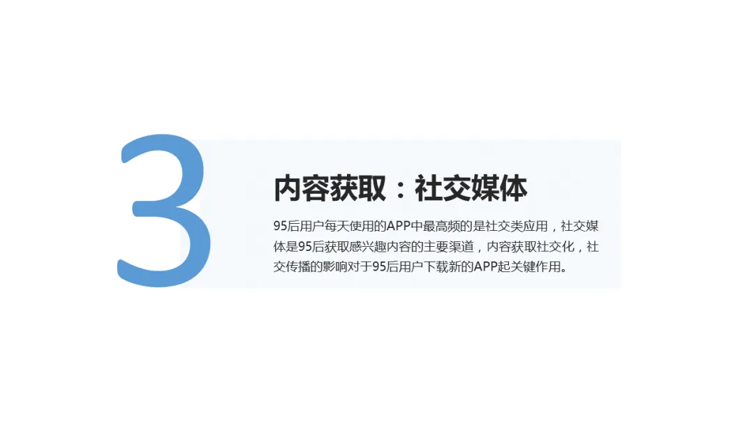 95后用户每天使用的APP中最高频的是社交类应用,社交媒体是95后获取感兴趣内容的主要渠道,内容获取社交化,社交传播的影响对于95后用户下载新的APP起关键作用。