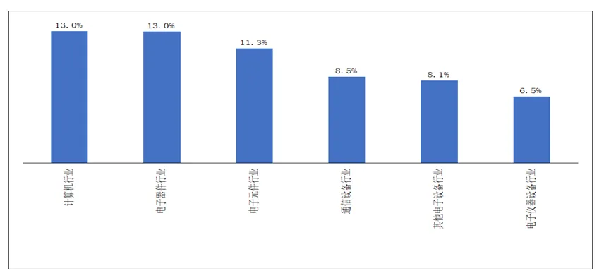 行业固定资产投资保持快速增长,投资聚焦技术升级领域。电子信息制造业投资占制造业比指标得分150.58,其上升幅度近三年连续保持在9个分值以上。2018年,电子信息制造业固定资产投资增长16.6%,快于整体制造业投资增速7.1个百分点,在制造业固定资产投资中占比提升0.6个百分点。电子器件制造、电子元件及电子专用材料制造和通信设备制造领域三个细分行业投资规模最大,占全行业投资近一半,其中前两个领域投资增长最快,增速分别达到37.8%和44.9%。行业固定资产投资方向表现出聚焦产业技术升级的新特点,其中电子器件领域最典型,12英寸晶圆厂是目前最先进的集成电路产线,2018年我国新投产和扩产扩建的12英寸产线有11条,总投资超过4400亿元[2],是电子器件固定资产投资的主要组成部分。