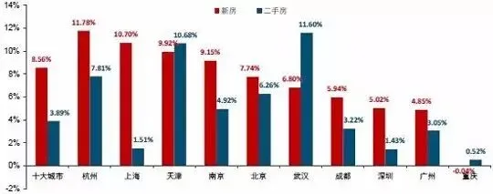 图:2016年三季度十大城市主城区二手房 与新房价格累计涨跌幅对比
