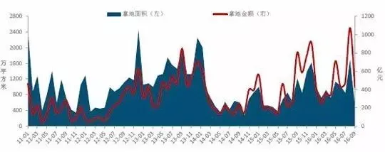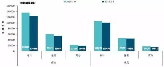 图:2015年与2016年1-9月全国300城市土地推出和成交面积