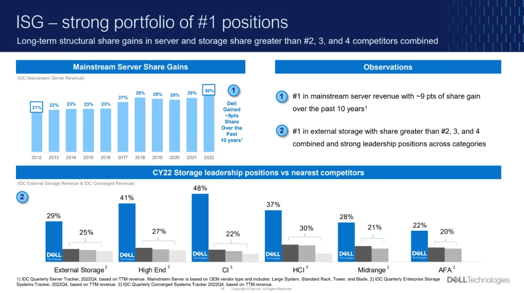 基础设施解决方案集团(ISG)第一财季营收为76亿美元。其中,在软件定义存储和领先的中端存储阵列需求增长的推动下,存储实现了38亿美元营收;在人工智能优化的高价值工作负载服务器需求推动下,服务器和网络实现38亿美元营收。