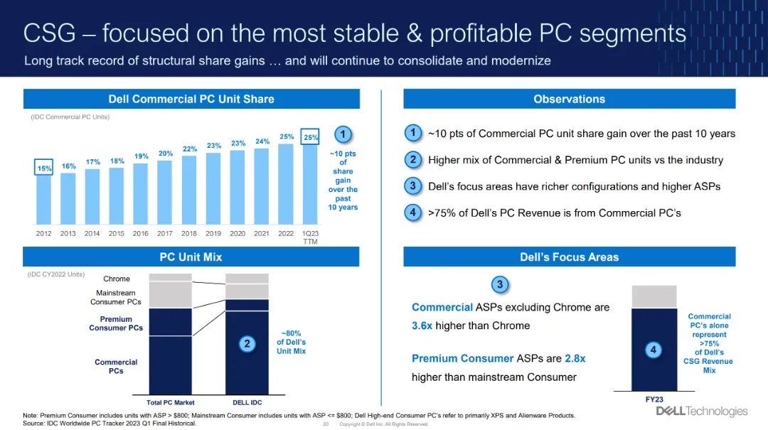 在充满挑战的经济环境下,我们依然表现出色。我们继续执行既有的定价策略并降低了运营成本,供应链在常态化之后持续表现良好并且领先于竞争对手。在第一财季,我们以创纪录的创新成果进一步兑现了我们的承诺,将戴尔APEX即服务能力扩展到全线产品组合中,帮助客户简化多云和边缘计算。