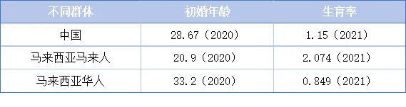 马来西亚有大量的华人居住,提供了一个展示同样的社会结构下,不同族群婚育趋势的样本。马来西亚马来人的平均初婚年龄为20.9岁,而马来西亚华人的平均初婚年龄为33.2岁,反映了华人的晚婚趋势,且初婚年龄越高,生育率越低。中国平均初婚年龄仍有推迟趋势,近年部分省市抽查结果显示平均初婚年龄已超过30岁,未来中国家庭在育儿上的祖辈支持能力预计将会越来越弱。