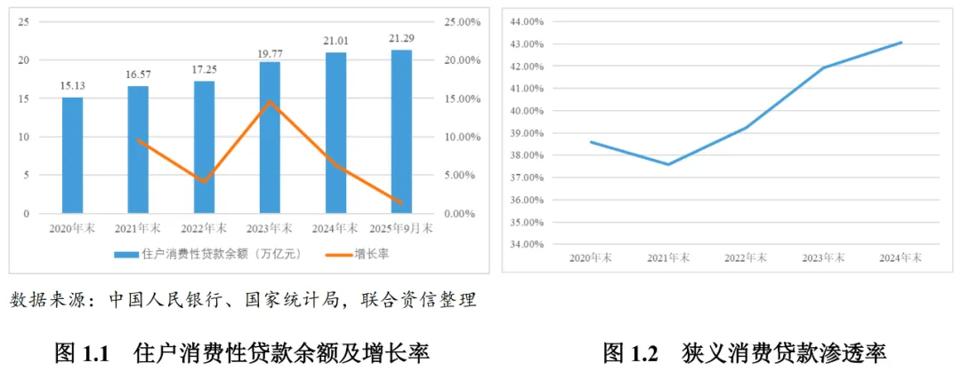 近年来,国家多措并举致力于促进消费的恢复和增长,其中2025年以来,《提振消费专项行动方案》《关于金融支持提振和扩大消费的指导意见》《个人消费贷款财政贴息政策实施方案》等一系列刺激性政策出台,支持扩大消费金融领域供给、加大个人消费贷款投放力度,鼓励开发各类场景类消费金融产品,并助力头部机构扩大市场份额,为消费金融市场的健康有序发展提供了良好的外部环境与政策驱动力;此外,信息科技的快速发展为消费金融市场的发展带来科技驱动力量。在扩内需、促消费的大背景下,消费金融行业借助金融科技优势,发挥专业化、特色化、差异化的金融功能,消费金融行业整体规模持续增长(见图1.1)。根据中国人民银行统计数据显示,2025年9月末我国住户贷款中消费性贷款(不含个人住房贷款)余额21.29万亿元,较上年末增长1.33%,增速明显放缓。同时,在房地产市场低迷和居民按揭贷款规模收缩的背景下,银行等金融机构大力发展零售消费贷款业务以保证贷款规模的稳定性,加之政策环境对消费的持续促进、金融机构消费信贷产品更加多元化以及金融科技水平的进步等因素的综合影响,居民对于消费信贷的接受度与使用意愿有所提升,近年来我国狭义消费贷款渗透率呈现波动上升的态势(见图1.2),对于整体消费金融市场规模的增长形成一定助力。另一方面,考虑到整体宏观经济仍相对低迷、消费贷贴息等政策刺激效果仍待显现,未来消费金融市场整体规模增长尚待观望。