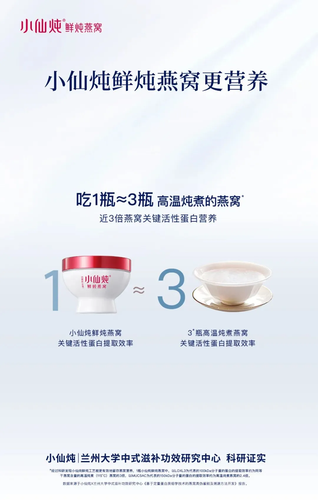 从消费需求来看,消费者购买鲜炖燕窝最看重的关键因素之一是它的营养价值。此前,小仙炖联合中国检验检疫科学研究院、兰州大学中式滋补功效研究中心,围绕鲜炖燕窝价值优势开展了专项研究。实验证明:鲜炖燕窝的营养价值优势凸显,通过实验发现小仙炖鲜炖专利可以使燕窝可吸收总蛋白的提取效率达到147.06%,相当于高温炖煮燕窝的2.3倍。在小仙炖鲜炖专利炖煮的鲜炖燕窝中,以LOXL3、MUC5AC为代表的燕窝关键活性蛋白相对提取效率可达295.7%,1瓶小仙炖鲜炖燕窝中以LOXL3为代表的100kDa分子量的关键活性蛋白是高温炖煮燕窝的3倍。