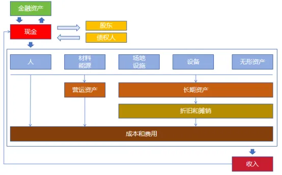 公司先投入人员、设备、场地、采购原材料等,为客户提供商品或服务创造价值,客户满意后获得公司获得收入,持续投入和产出,形成循环,收入减成本和费用就是利润。