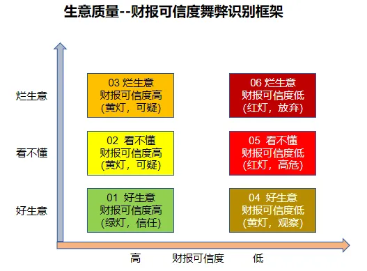 Ø象限6:烂生意+财报可信度低,放弃,红灯;