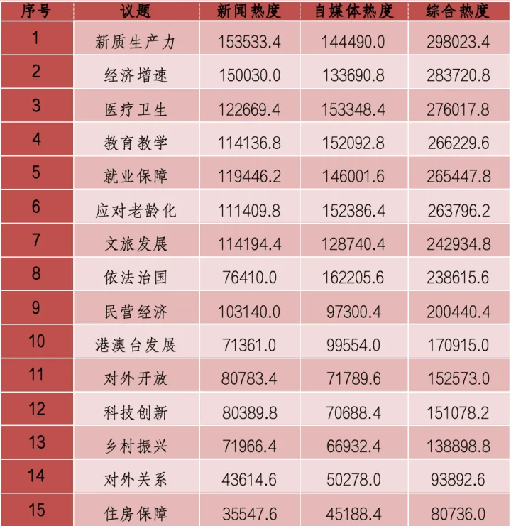 近日,十四届全国人大二次会议、全国政协十四届二次会议完成各项议程,圆满落下帷幕。今年是新中国成立75周年,是实现“十四五”规划目标任务的关键一年,推进中国式现代化建设前景壮阔,任务艰巨,全国两会备受境内外舆论关注。人民网舆情数据中心对媒体报道、网民热议话题、热点议案提案进行数理统计和分析,结合舆情热度,梳理出2024年全国两会舆论关注的十大议题。