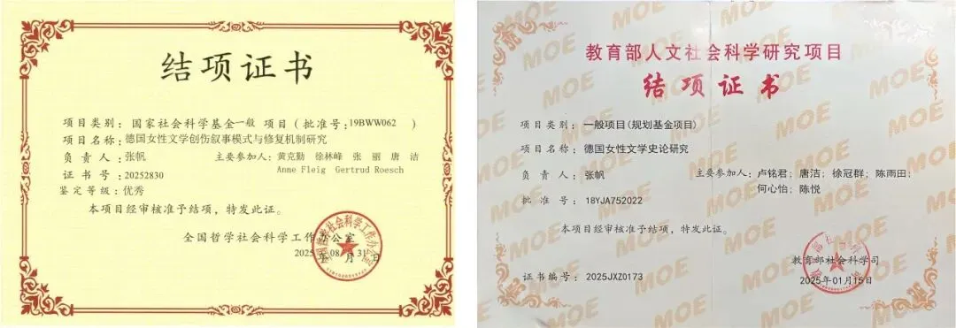 2025年,国家级与省部级课题结项2项,其中张帆教授主持的国家社科基金项目“德国女性文学创伤叙事模式与修复机制研究”以“优秀”等级结项。