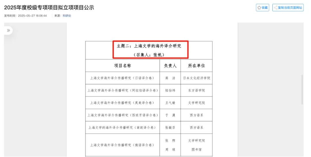 “上海文学的海外译介研究丛书”(丛书主编:张帆)获上海外国语大学校级专项项目立项,共计6卷,由上海人民出版社出版。