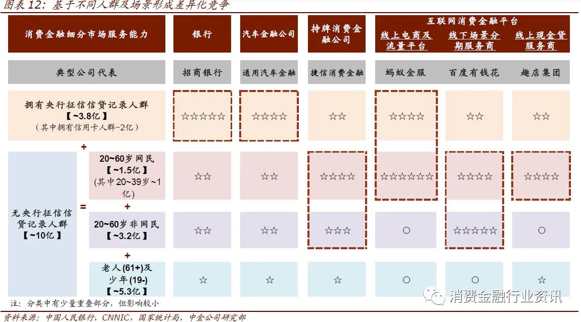 凭借不同的获客优势及人群定位,互联网平台与传统金融机构展开差异化竞争。聚焦金字塔顶端人群的银行及汽车金融公司,其贷款主要集中在按揭、汽车和信用卡,出于运营成本及风控标准考虑,其仍将牢牢把握信用卡优质人群(~2亿);互联网消费金融平台通过提供线上电商分期、线下消费分期及线上现金贷产品,主要覆盖无央行征信信贷记录人群(其中20-60岁人群~5亿),如蚂蚁金服依靠支付宝入口已发展1亿+花呗用户——超过60%花呗用户尚无信用卡、每4个90后就有1个使用花呗。