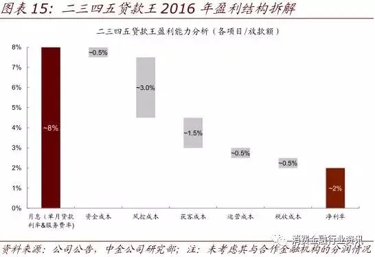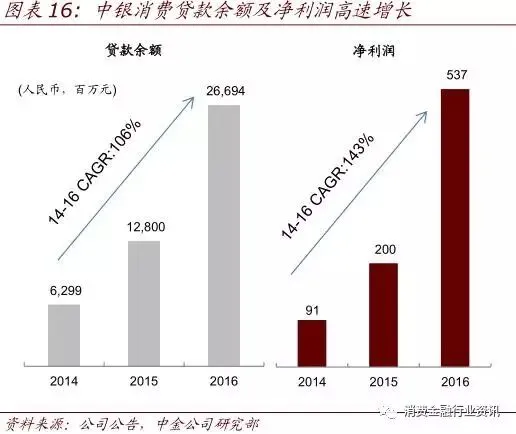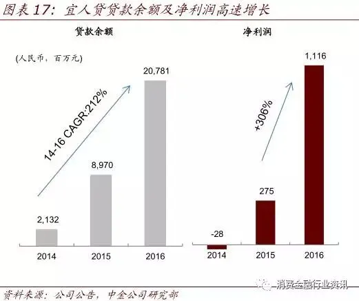 我们观察中银消费金融公司以及宜人贷财务表现,其净利润增速远高于贷款余额——2016年中银消费净利润/贷款余额分别增长168%/109%至5.4/267亿元、宜人贷净利润/贷款余额分别增长306%/132%至11.2/208 亿元,表明其贷款规模持续扩张的同时,盈利结构亦有所改善,具体而言:
