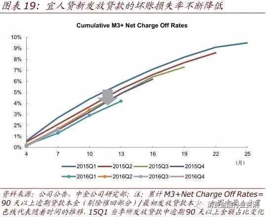 ►资金成本:中银消费16年净息差提升1.7ppt至10.8%,主要由于贷款利率持平(~14%)的基础上,资金成本下降1.7ppt至3.2%;资金来自P2P平台的宜人贷同样受益于资金端利率下行向贷款端利率传导的滞后性,并探索拓展银行等渠道进一步降低资金成本。