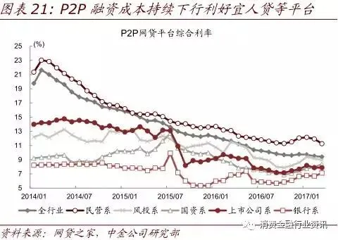 银行(1%~2%;主要为吸收存款)<持牌消费金融公司(3%~5%;主要为股东存款、银行借款及同业拆借)<互联网巨头(4%~6%;主要为小贷公司股东注资、银行借款及 ABS)<领先网贷平台(7%~12%;主要为P2P资金)。