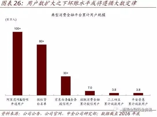 长期来看,大数定律下目标客群质量决定平台坏账水平。随着各大平台覆盖的用户基数的不断扩大,如阿里借呗&花呗用户超过1亿、京东金条&白条/腾讯微粒贷等领先平台突破千万级、二三四五/捷信消费/招联消费等平台已达到数百万级,最终获客方式(特定场景/流量的用户质量)决定了各家平台最终的坏账区间。