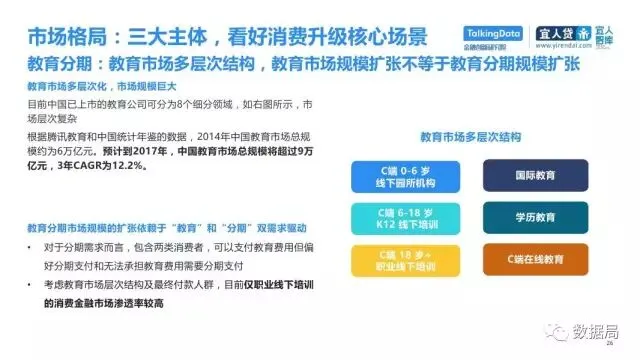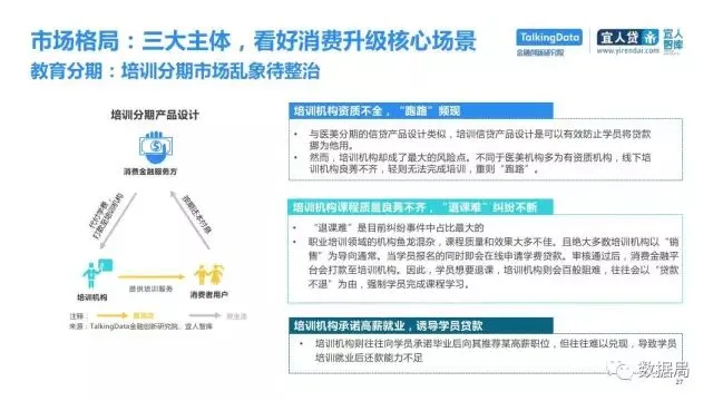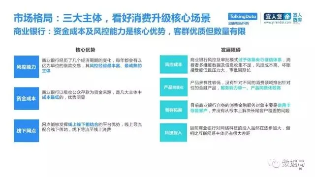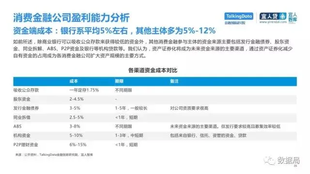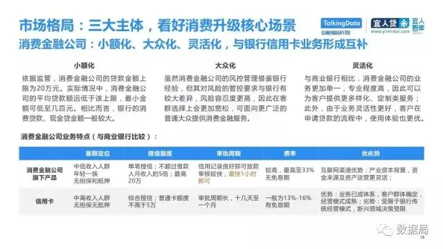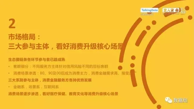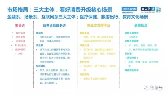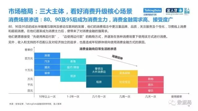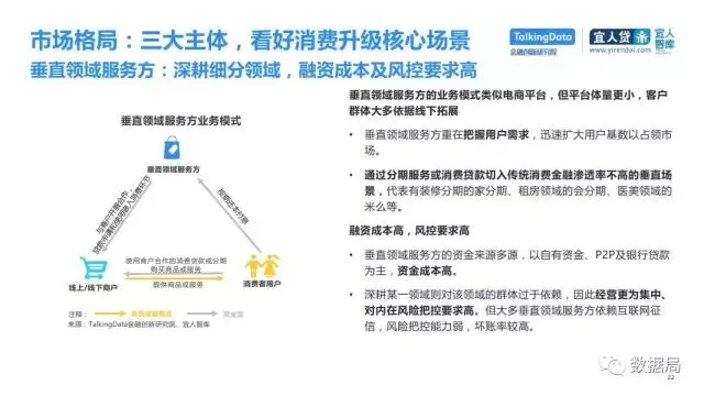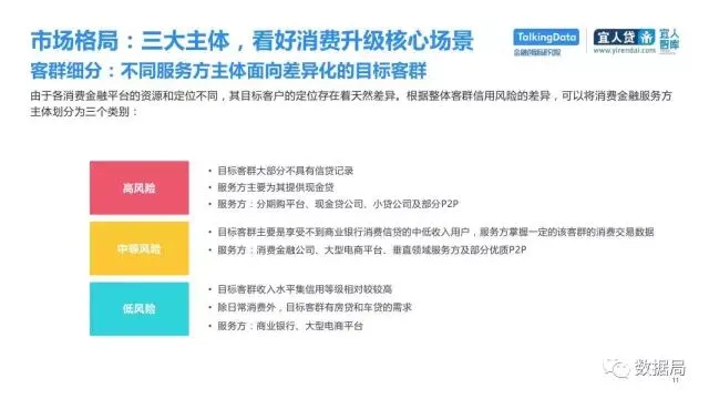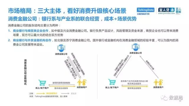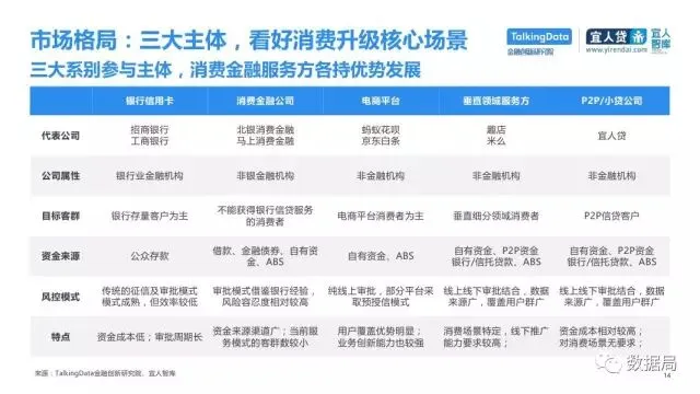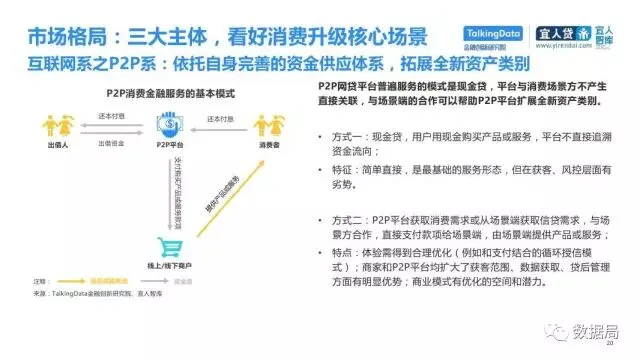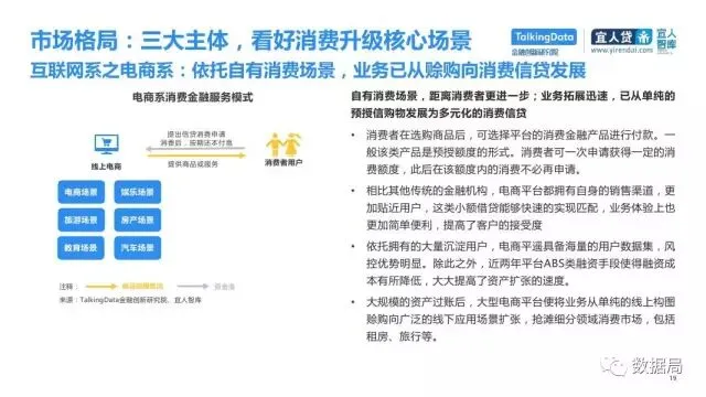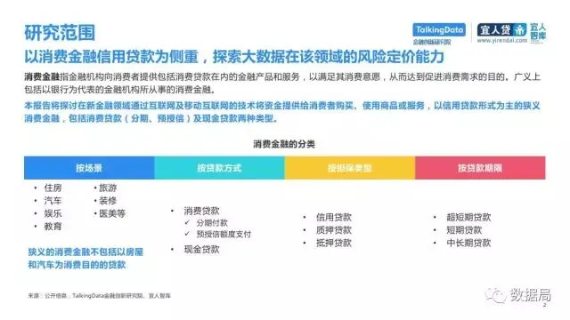 近日,TalkingData与宜人智库联合发布《中国消费金融发展模式研究报告》,以消费金融信贷为侧重,探索大数据在该领域的风险定价能力,探讨在新金融领域以信贷形式为主的狭义消费金融。消费金融指金促进消费需求的目的。广义上包括以银行为代表的金融机构所从事的消费金融。