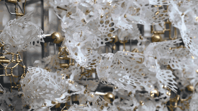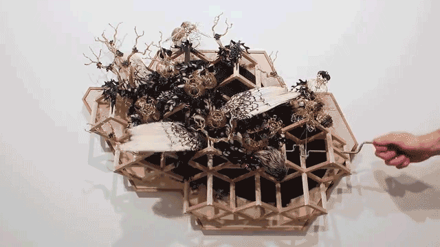 西雅图艺术家Casey Curran使用金属丝、激光切割丙烯酸,铝和雕刻黄铜来建造雕塑环境。其工作借助电脑或者手动曲柄系统一直保持生长开花和开合不变。这些互动系统请受众不只是观者,更是参与行为表现者。