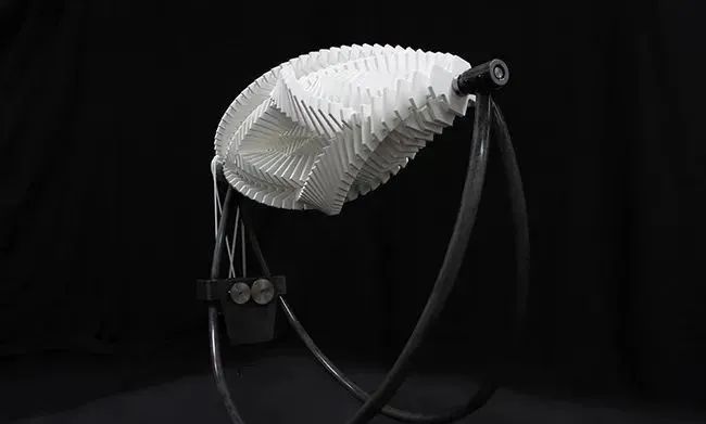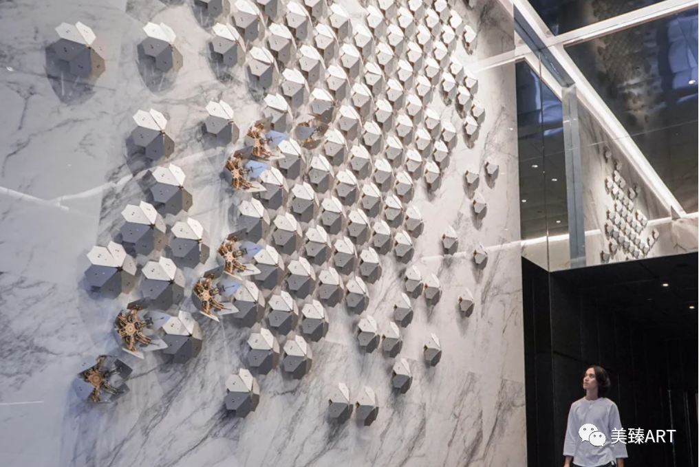 灵感是来自马自达转子引擎的运动,将仿佛没有边界的几何零件,固定于轴上,并开始看似混乱地转动。77 片零件组成一对翅膀,两边以稍微不同的速度,往反方向转动,因此塑造出不断解构,却又不断创造的视觉冲击。