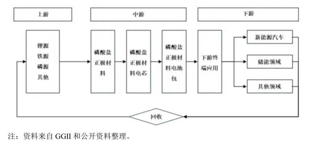 磷酸盐型正极材料上游行业主要分为两类,一类主要为提供生产工具、生产设备的供应商,主要提供各类工具、机器设备、专用或通用模具等;另一类主要为锂源、铁源、磷源及天然气等原料和能源供应商。通过与上游原材料行业建立较为紧密的合作关系,可以在一定程度上降低生产成本,提高竞争力。报告期内,受到新能源汽车市场迅速发展和储能市场放量的推动,以锂源为代表的上游原材料供需变化较大,导致价格波动较大,但长期来看发展趋势总体平稳向好。行业的下游用作制备锂离子电池,并最终应用于新能源汽车、储能等领域。相关产业链情况如下所示: