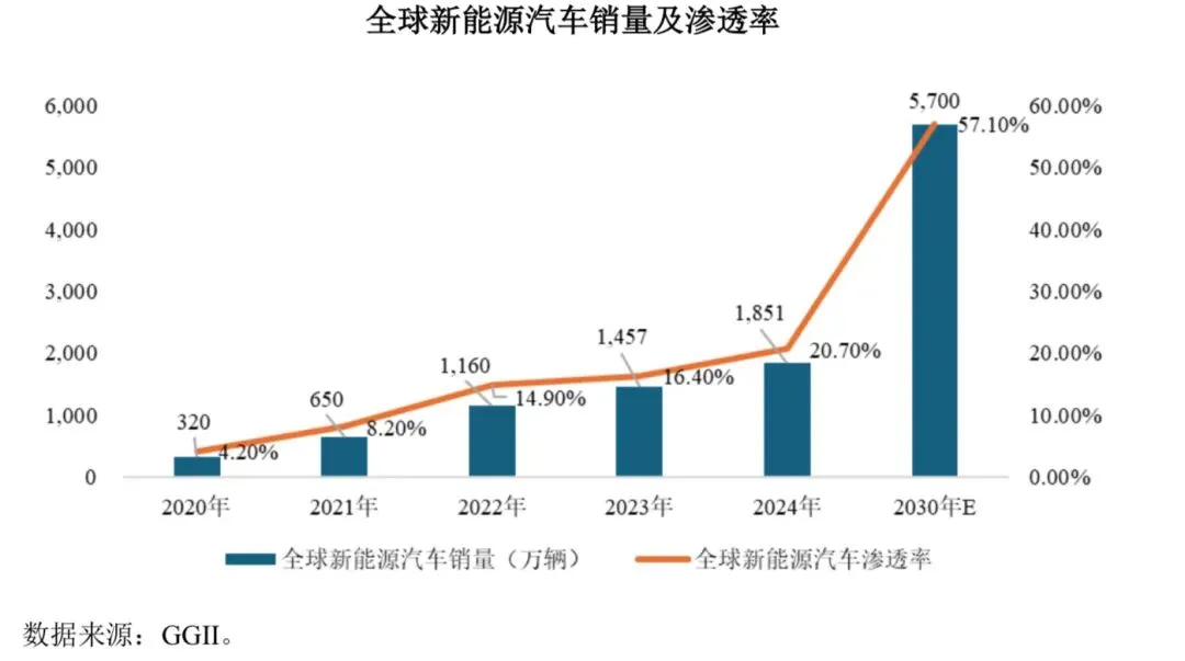 受益于新能源在售车型数量快速增加、智能化水平提升、续航能力提升、充换电基础设施不断完善等因素,全球新能源汽车市场需求持续增长。根据 GGII 数据,全球新能源汽车销量从 2020 年的 320 万辆增长至 2024 年的 1,851 万辆,年均复合增长率为 55.1%,全球新能源汽车渗透率从 2020 年的4.2%提升至2024年的 20.7%。GGII 预计 2030 年全球新能源汽车销量增长至 5,700 万辆,渗透率将进一步提升至 57.1%,2024 年至 2030 年年均复合增长率为 20.6%。中国为全球最大的新能源汽车市场,2024 年新能源汽车销量为 1,287 万辆,新能源汽车销量达到汽车总销量的 40.9%。