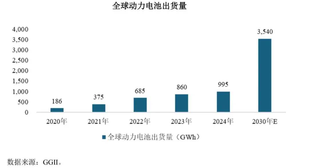 新能源汽车销量增长,带动全球动力电池出货量持续增长,且预计将保持增长趋势。根据GGII 数据,全球动力电池出货量自 2020 年的186GWh 增长至2024年 995GWh,年均复合增长率为 52.1%;并预期将增长至 2030 年的 3,540GWh,2024 年至 2030 年年均复合增长率为 23.6%。近年来,中国动力电池市场经历了快速发展,已成为全球最大的动力电池市场,中国动力电池出货量自 2020 年的80GWh 增长至 2024 年的 780GWh,年均复合增长率为 76.7%。2025 年 1-9 月,我国动力电池出货量达到 785GWh,较上年同期增长 47%,已超去年全年水平,保持较高的增长速度。