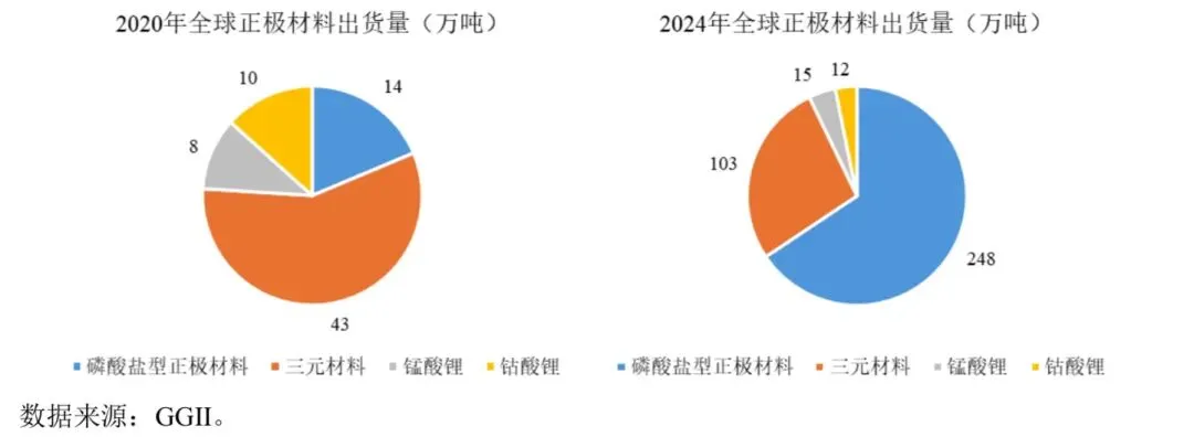 随着新能源汽车及储能市场快速发展,全球正极材料出货量持续攀升。根据 GGII 数据,全球正极材料出货量从2020 年的74 万吨增长至2024 年的377 万吨,年均复合增长率为 50.1%。得益于在新能源汽车动力电池的应用占比提升以及储能市场高速增长等因素,磷酸盐型正极材料在正极材料中增速最高,全球出货量自2020 年的14 万吨增长至 2024 年的248 万吨,年均复合增长率为 104.1%。中国 2024 年正极材料出货量为 335 万吨,同比增长 34.9%,其中磷酸盐型正极材料出货量为246 万吨,同比增长 49.3%。