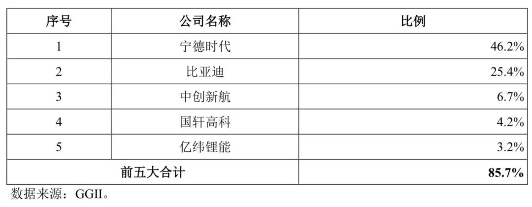 根据 GGII 数据,2024 年国内前五大动力电池企业的装机量合计占比为85.7%,行业呈现高度集中态势,具体情况如下:
