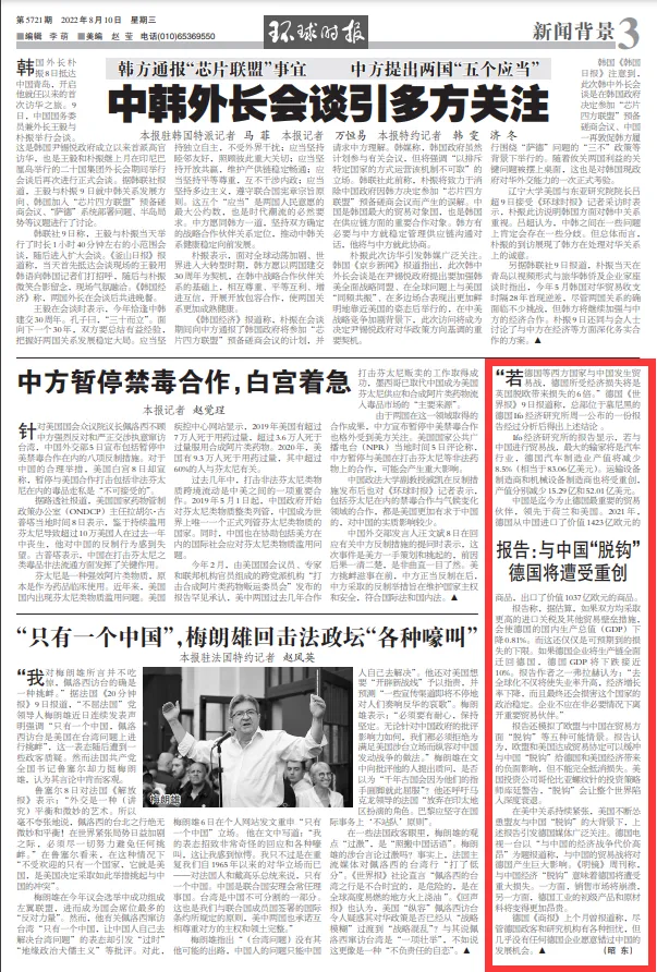 在美中关系持续紧张,美国不断怂恿盟友与中国“脱钩”的大背景下,上述报告引发德国媒体广泛关注。德国电视一台以“与中国的经济战争代价高昂”为题报道称,与中国的贸易战将对德国产生巨大影响。《明镜》周刊称,与中国经济“脱钩”意味着德国将遭受重大损失。一方面,销售市场将崩溃,另一方面,德国工业的初级产品和原材料将变得更加昂贵。