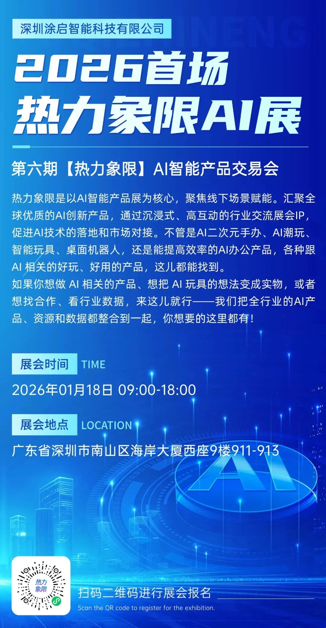 欢迎报名2026年1月18日热力象限深圳AI产品展,一起见证AI产业的未来,拥抱财富,展会时间是上午9点到下午6点。