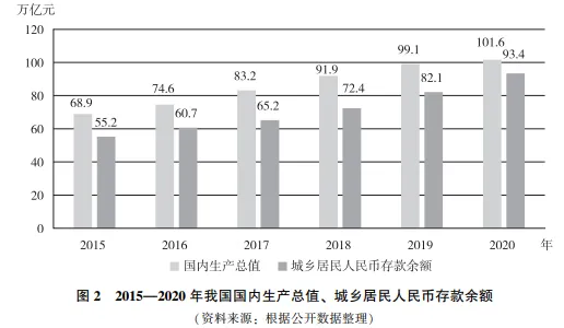 2015年至今,我国国内生产总值和城乡居民人民币存款余额一直保持稳定增长态势,特别是在2020年新冠肺炎疫情的冲击下,我国经济增长保持韧性,全年实现国内生产总值101.6万亿元,相比2019年增长2.3%,成为全球唯一实现经济正增长的主要经济体。如图2所示,2020年城乡居民人民币存款余额约是2015年的1.7倍,其年均增速略高于国内生产总值增速。国内生产总值、城乡居民人民币存款余额的增长意味着社会财富总额和居民可支配收入的增加,这无疑为互联网消费金融发展提供了肥沃的“土壤”。