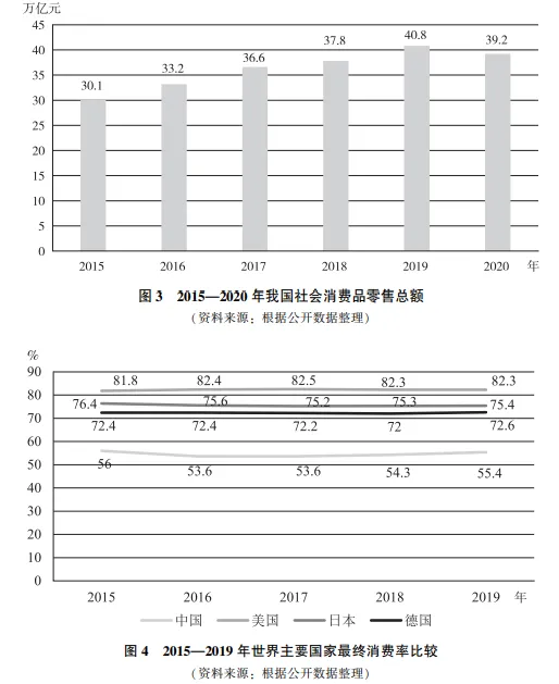 从消费总规模来分析,2015年至2019年,我国社会消费品零售总额保持稳定增长。2020年受新冠肺炎疫情影响,社会消费品零售总额为39.2万亿元,较2019年下降3.92%,但与2015年相比仍呈增长趋势(如图3所示);从最终消费率来分析,与发达国家相比,我国最终消费率仍有较大差距(如图4所示);从国内消费发展宏观环境来分析,随着居民可支配收入的不断提高以及消费升级的持续推进,我国消费市场容量巨大,未来仍有较大潜力可供释放。特别是在中央提出构建“双循环”新发展格局的背景下,关注国内市场、释放国内需求和消费潜力已经成为经济社会高质量发展的出发点和落脚点。从近年来我国经济发展的实际情况来分析,消费已经成为拉动经济增长的第一驱动力,未来依然将为经济发展提供持续支持。