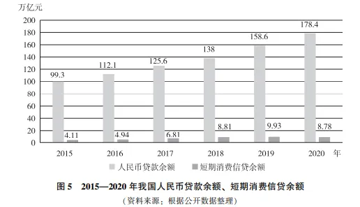 从贷款余额情况的角度分析,2015年至2020年,我国人民币贷款余额持续增长,其中2020年人民币贷款余额为178.4万亿元,较上一年增长12.48%。受新冠肺炎疫情冲击,2020年短期消费信贷余额为8.78万亿元,较2019年下降11.6%,但与2015年相比,总体增长趋势未发生改变(如图5所示)。随着未来一系列“稳增长、促消费”政策的出台,预计短期消费信贷余额将继续增长。