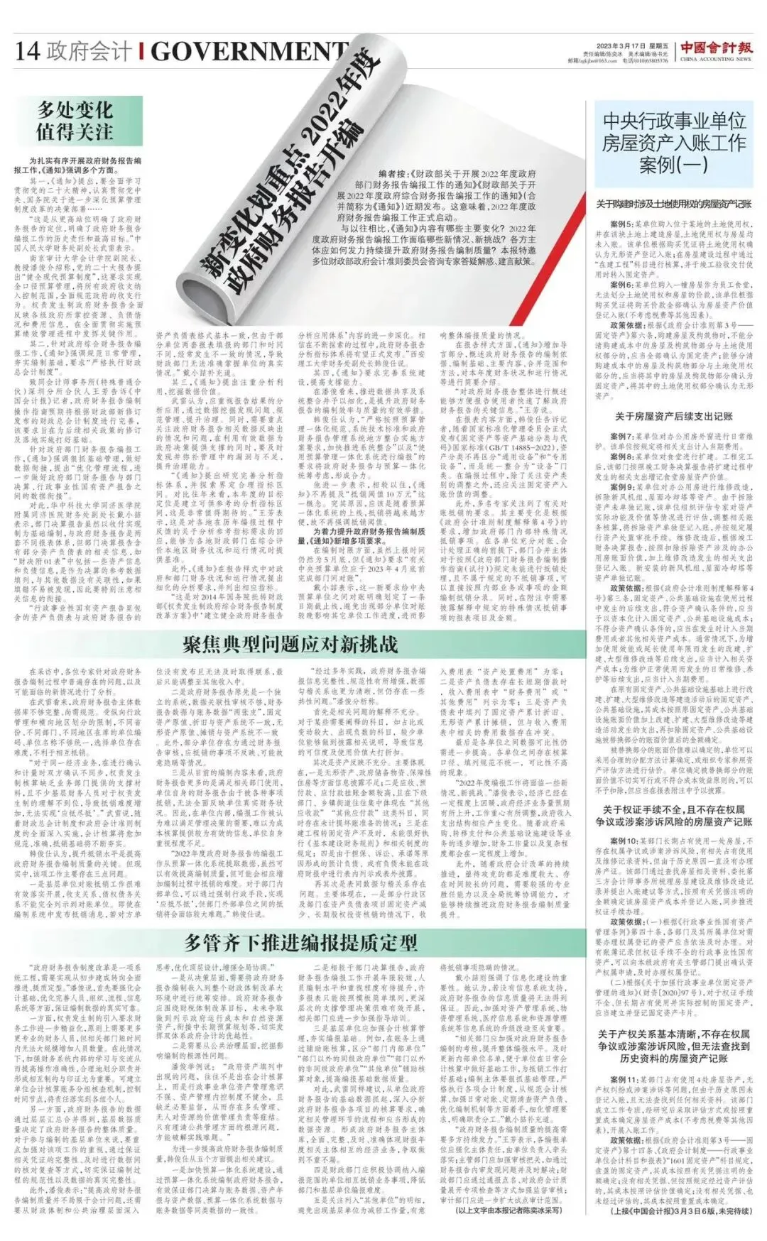 编者按:《财政部关于开展2022年度政府部门财务报告编报工作的通知》《财政部关于开展2022年度政府综合财务报告编报工作的通知》(合并简称为《通知》)近期发布。这意味着,2022年度政府财务报告编报工作正式启动。与以往相比,《通知》内容有哪些主要变化?2022年度政府财务报告编报工作面临哪些新情况、新挑战?各方主体应如何发力持续提升政府财务报告编制质量?本报特邀多位财政部政府会计准则委员会咨询专家答疑解惑、建言献策。