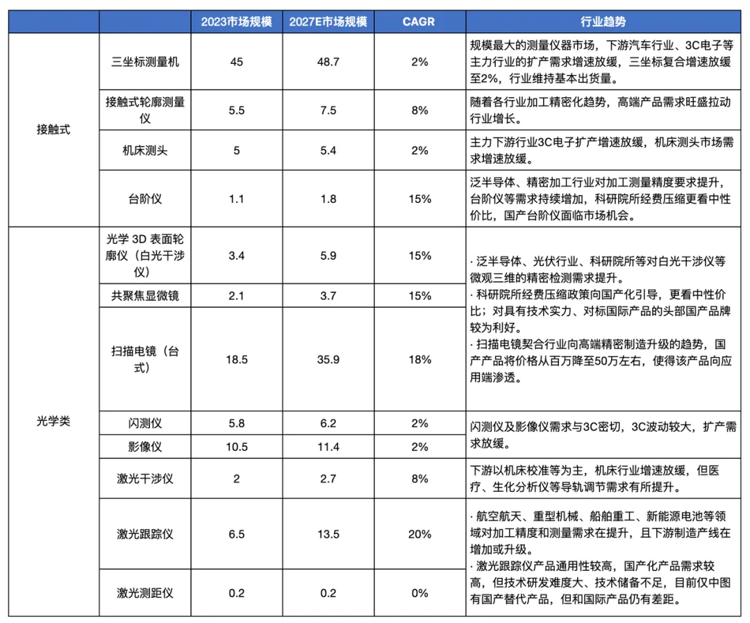精密测量仪器产品中,市场规模较大的单品包括三坐标测量机、扫描电镜、影像仪等,2023年国内市场规模分别达到45亿元、18.5亿元、10.5亿元;未来市场需求增速较快的单品主要包括激光跟踪仪、扫描电镜、台阶仪、白光干涉仪、共聚焦显微镜,其2022-2027年复合增速分别达到20%、18%、15%、15%、15%。