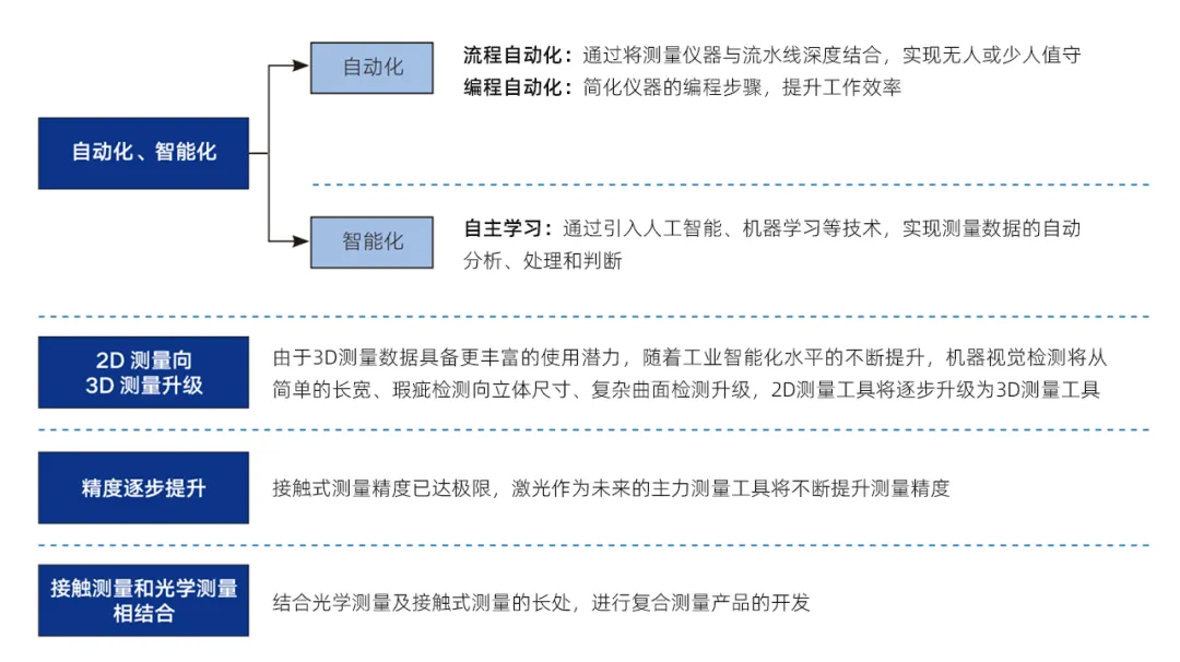 整体而言,精密测量技术整体将向着自动化、智能化、3D化方向发展,逐步提升测量仪器的精度并探索多种不同测量方式相结合的可行性,具体如下图所示: