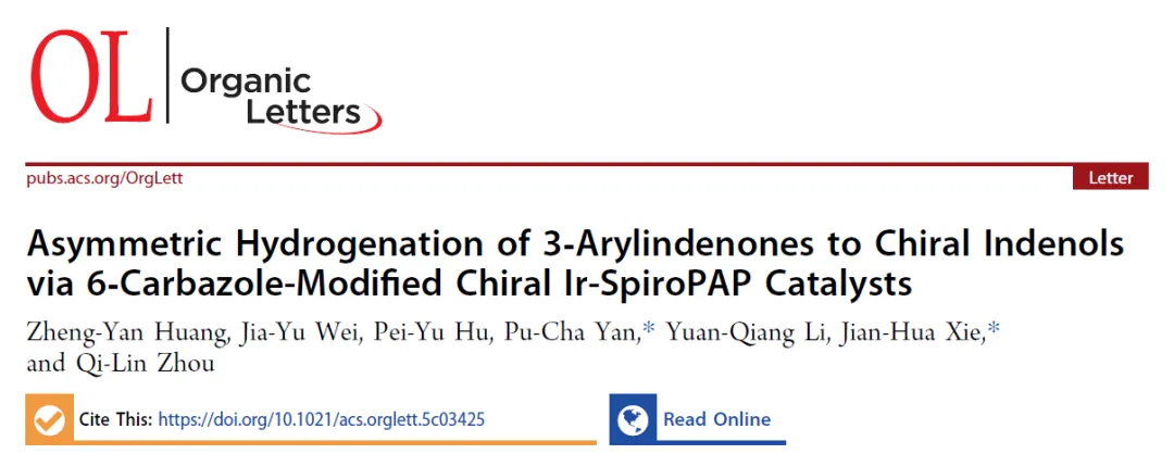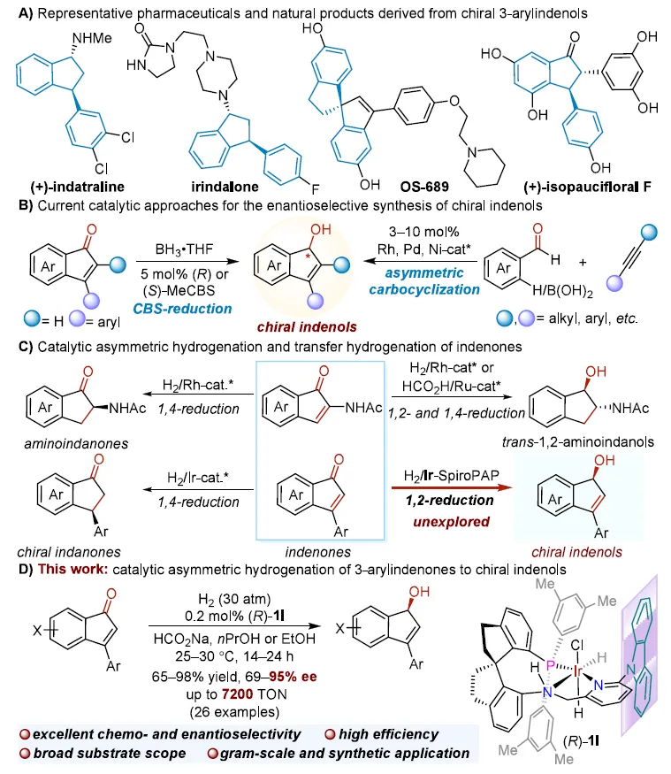 手性茚醇,尤其是3-芳基茚醇,是多种药物和生物活性分子的关键手性砌块,广泛存在于天然产物和手性药物分子中,如抗抑郁药(+)-茚达曲林、降压药伊林达隆、雌激素受体调节剂OS-689和具有抗骨质疏松功效的天然产物(+)-isopaucifloral F等。近日,浙江九洲药业严普查团队与南开大学元素有机化学全国重点实验室谢建华教授课题组合作,在该领域取得了突破,使用6-咔唑修饰的手性Ir-SpiroPAP催化剂,实现了3-芳基茚酮的不对称氢化反应,以高产率(最高98%产率)、高对映选择性(最高95% ee)和高效率(7200 TON)获得手性茚醇类化合物,相关成果已在国际著名化学期刊Organic Letters上在线发表。
