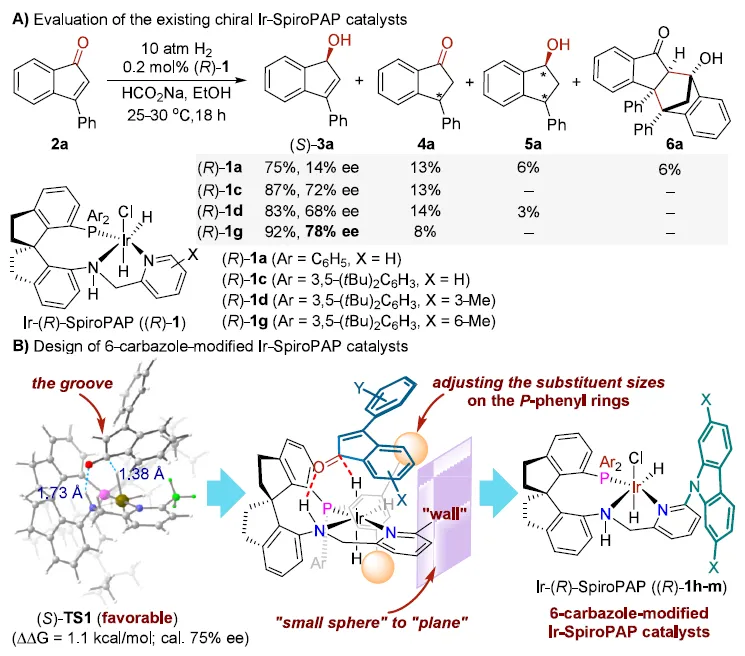 酮类化合物的不对称氢化被认为是合成手性醇类化合物的理想路径,具有100%的原子经济性、步骤简洁和环境友好等优点。然而,将不对称氢化应用于茚酮这一类特殊的环内α,β-不饱和酮时,却面临着C=O和C=C双键的选择性还原、手性茚醇产物易发生1,3-氢迁移转化为不需要的茚满酮、手性催化剂难以精确识别茚酮底物中极其微小的空间位阻差异等挑战。研究团队基于其在手性Ir-SpiroPAP催化剂以及不对称氢化α,β-不饱和酮方面的丰富经验,成功开发了6-咔唑修饰的Ir-SpiroPAP催化剂,同时解决化学选择性和对映选择性问题。并且摒弃具有破坏性的强碱,采用甲酸盐作为温和的碱,在实现高效催化的同时,抑制1,3-氢迁移等副反应,保护手性茚醇产物的完整性。