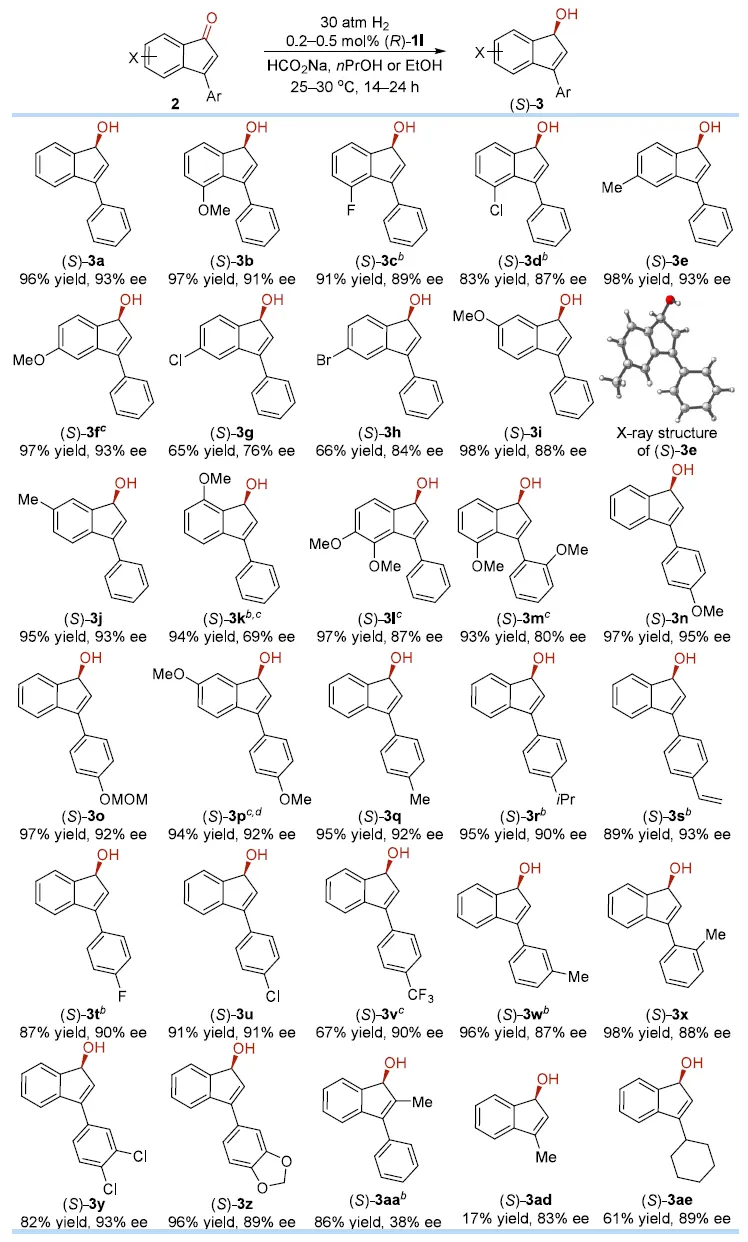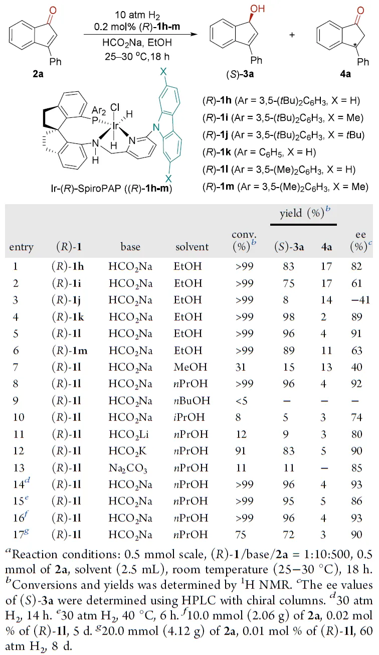 作者团队合成了一系列6-咔唑修饰的Ir-SpiroPAP催化剂。(R)-1h在咔唑单元上无取代基,有着更好的对映选择性。P-苯环的3,5位上有小的甲基取代基催化剂(R)-1l,能够以96%收率和91% ee值得到产物(S)-3a。最后通过对反应条件进一步优化,建立了最优的反应条件:(R)-1l为催化剂,H2压力为30 atm,甲酸钠为碱,溶剂为乙醇或正丙醇,反应温度为25-30℃。在该条件下,模型底物2a能以96%的收率以及93% ee值得到相应的手性茚醇产物(S)-3a。放大至克级规模,催化剂用量可降低0.01 mol%,能够得到72%收率和90% ee值,计算出该催化剂的转化数(TON)高达7200。